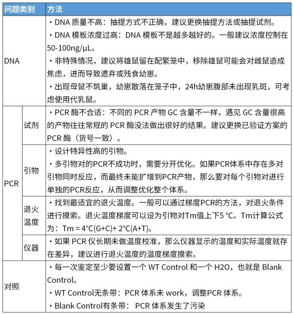 小鼠基因组鉴定也是常常困扰新晋铲屎官的点,鼠博士这边的建议是,首先按照小鼠来源机构(实验室/供应商)小鼠基因型具体检测方案来执行,若还有一些问题,可以参考下表进行改进。