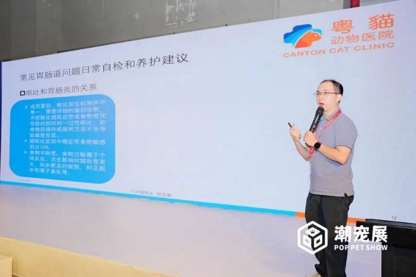 广州粤猫动物医院院长、主治医生、华南农业大学兽医硕士苏永康老师在大会上为大家带来《宠物常见肠道疾病的种类与预防》。宠物常常出现“玻璃胃”现状,尤其是猫只,他从猫常见的饮食习惯入手,详细讲解了宠物的常见胃肠道问题日常自检和养护建议,以及其他常见对胃肠道影响因素和护理建议。