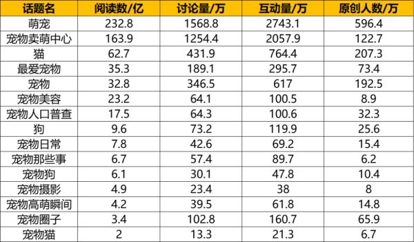 在关于宠物的话题讨论中,#萌宠#话题的讨论量达到了232.8亿次,讨论量1568.8万,互动量2743.1万次,原创人数596.4万,是所有宠物类话题中数据表现最亮眼的一个。
