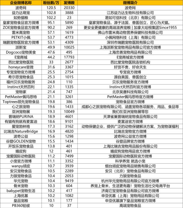 此外,小编还给大家整理了各大宠物品牌在微博上的粉丝情况,共有41个粉丝过10万的品牌。具体如下: