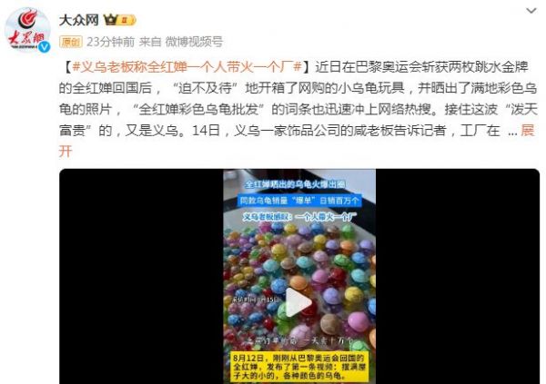 全红婵作为如今最炙手可热的体育偶像,她的喜好也是带动彩色乌龟的畅销。根据国内媒体报道,义乌一家饰品公司老板告诉记者,工厂正在加班加点生产这款乌龟玩具,且每天新增订单最高能达到100万个。