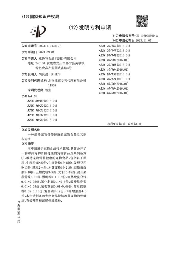 网址: 一种维持宠物骨骼健康的宠物食品及其制备方法2023.pdf专利下载 https://www.mcbbbk.com/newsview1330578.html