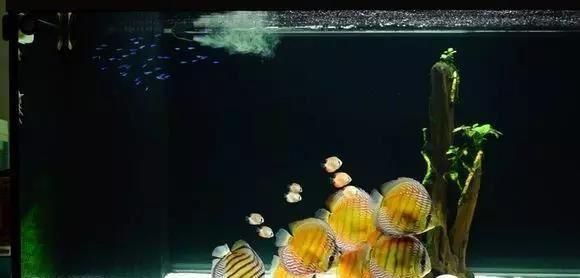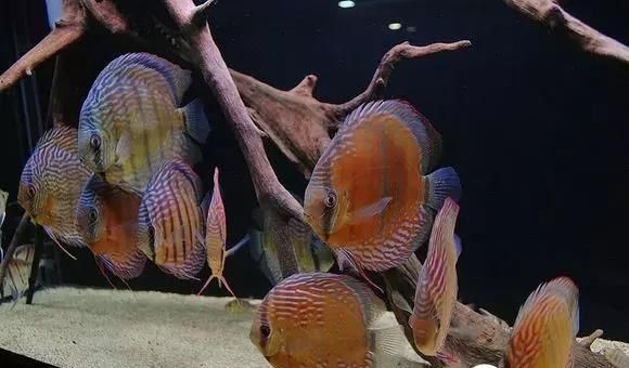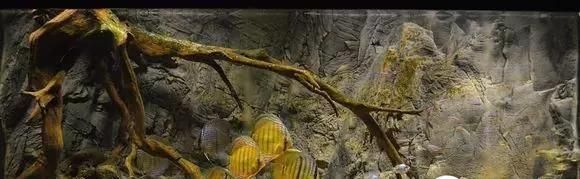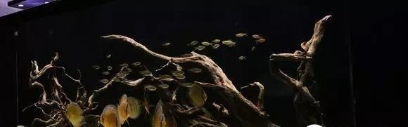 缸铺的沙跟上面的就不大一样了,有点海沙的感觉,很细,相信会给过滤系统带来不小的压力。鱼缸尺寸应该在1.2m-1.5m之间,配了大概7-8条七彩,然后搭配了类似企鹅灯的鱼,让七彩去促使灯鱼群友,但其实等大家都熟悉了,做了好伙伴,就不会再去群游啦。没有水草搭配,纯粹的沉木缸,适合观赏,沉木中间形成一个空隙,让鱼正好在鱼缸中间活动,方便欣赏。
