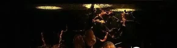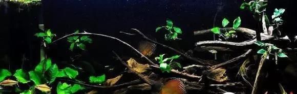这个就是另外一个流派啦,纯粹的模拟野生环境流派,几个瓦数不大的小射灯分布在鱼缸几处,鱼缸里杂乱的沉木树枝,底部薄沙上面一些小石块,榄人叶,碎树枝,这种布景会牺牲掉一些我们对鱼的感官要求,只能若隐若现中看到鱼的花纹,好美。