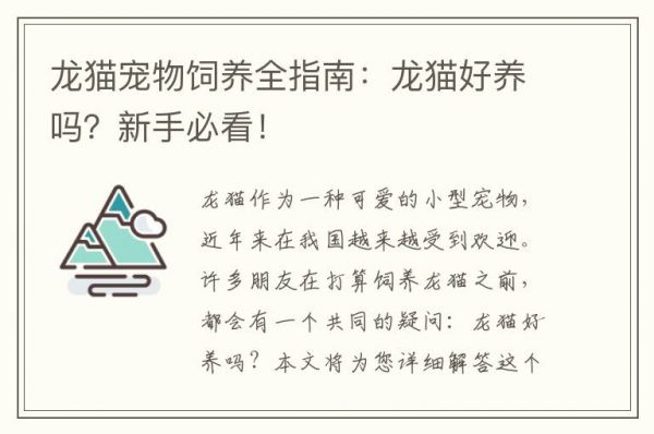 总结来说,龙猫是一种比较好养的宠物,但前提是主人需要用心去了解它们的需求,并提供足够的关爱。如果您已经做好准备迎接这位可爱的小家伙,那么就行动起来吧!相信龙猫一定会成为您家庭的好伙伴。