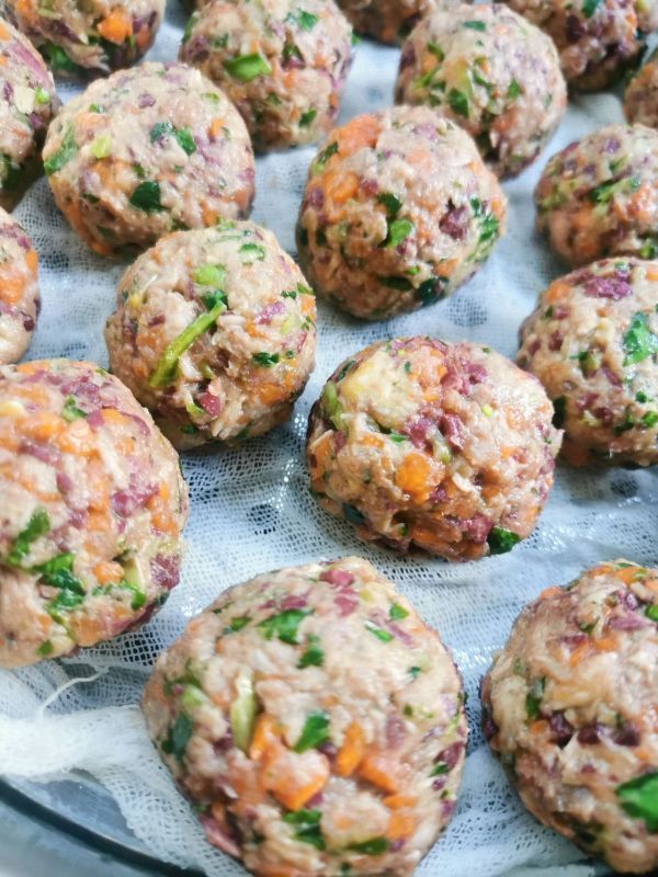 关键词:低脂,营养,美毛,有利于肠胃吸收。 1.一次多做点,放进冰箱,吃的时候拿到微波炉转转,很方便,偶尔给狗狗加加餐,改善下伙食。 2.我一般是做完放到冷冻室,要吃的时候拿一两个出来解冻,然后和狗粮拌在一起喂狗狗,或者单独当做零食给狗狗吃。 3.成分里有燕麦代替面粉,降低了热量;加入了橄榄油、三文鱼,可以美毛。 4.我做过很多次了,我的两只泰迪都很喜欢吃,所有食材都是对狗狗肠胃身体很好的,如果三文鱼不方便购买,可以不放,或者加入猪肉,或者少量的猪肝。