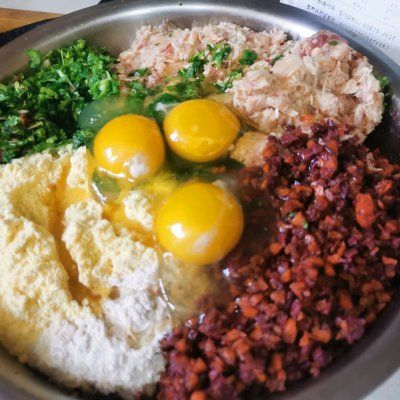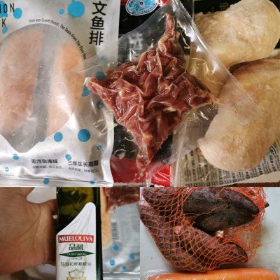 玉米面 70克燕麦片 70克鸡蛋 3个胡萝卜 3根橄榄油 适量三文鱼 200克鸡胸肉 500克牛肉 160克白菜 适量紫薯 400克做法步骤