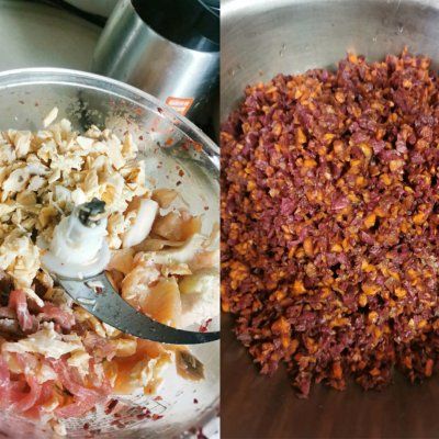 2、三文鱼先放入水中煮,待煮出鱼油后,捞出鱼,把鱼鸡肉牛肉和紫薯胡萝卜白菜,用机器打碎,鱼油和鱼汤保留