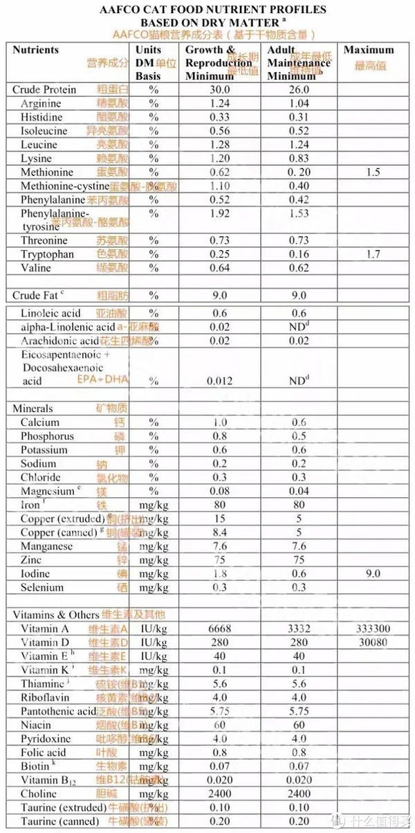 可以明显的看出,AAFCO标准比国标标准要高很多,猫粮要求47种营养素,而且不仅有最低指标,还有最高指标,还有营养素所占比例。