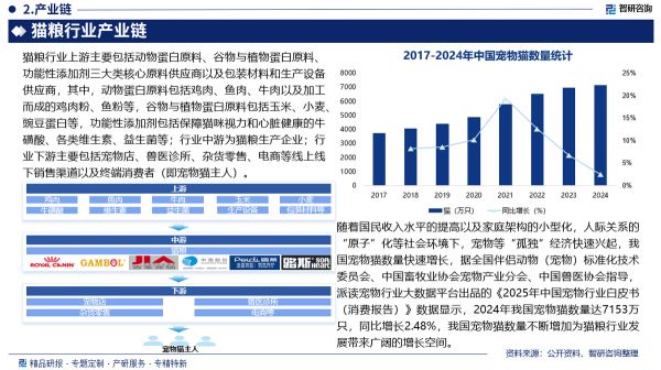 行业发展有利因素:随着国民收入水平的提高以及家庭架构的小型化,人际关系的“原子”化等社会环境下,宠物等“孤独”经济快速兴起,我国宠物猫数量快速增长,据全国伴侣动物(宠物)标准化技术委员会、中国畜牧业协会宠物产业分会、中国兽医协会指导,派读宠物行业大数据平台出品的《2025年中国宠物行业白皮书(消费报告)》数据显示,2024年我国宠物猫数量达7153万只,同比增长2.48%,我国宠物猫数量不断增加为猫粮行业发展带来广阔的增长空间。