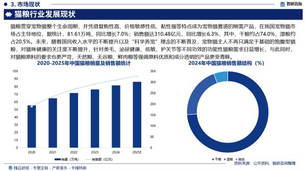 猫粮是为满足猫咪生长发育、日常活动需求,以肉类为主要原料,经加工制成的专用宠物食品,猫粮能满足猫不同生长阶段、生理状态的营养需求。猫粮贯穿宠物猫整个生命周期,并凭借复购性高、价格敏感性低、黏性强等特点成为宠物猫赛道的刚需产品,在我国宠物猫市场占主导地位,据统计,81.61万吨,同比增长7.0%;销售额达310.48亿元,同比增长6.3%,其中,干粮约占74.0%,湿粮约占20.5%。未来,随着国民收入水平的不断提升以及“科学养宠”理念的不断普及,宠物猫主人不再只满足于基础的饱腹型猫粮,对猫咪健康的关注度不断提升,针对美毛、泌尿健康、低敏、护关节等不同功效的功能性猫粮需求日益增长,与此同时,对猫粮原料的要求也更严苛,天然粮、无谷粮、鲜肉粮等强调原料优质和成分透明的产品更受青睐。