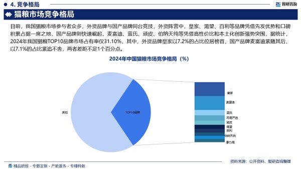 市场竞争格局:目前,我国猫粮市场参与者众多,外资品牌与国产品牌同台竞技,外资阵营中,皇家、渴望、百利等品牌凭借先发优势和口碑积累占据一席之地,国产品牌则快速崛起,麦富迪、蓝氏、顽皮、伯纳天纯等凭借高性价比和本土化创新强势突围,据统计,2024年我国猫粮TOP10品牌市场占有率仅31.10%,其中,外资品牌皇家以7.2%的占比位居榜首,国产品牌麦富迪紧随其后,以7.1%的占比紧追不舍,两者差距不足1个百分点。