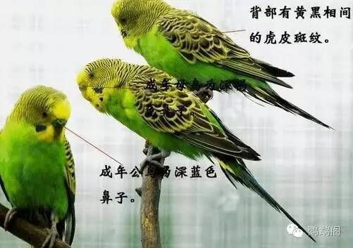绿色: 头羽毛和背面羽毛一般黄色并且有黑条纹, 头发颜色和条纹象老虎皮肤将军, 因此叫老虎皮肤鹦鹉。