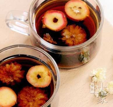 菊花山楂水:白菊花、金银花、山楂煮水,(注意先煮山楂,关火前放菊花和金银花)常温后放蜜糖饮用。清热解毒,消食明目。一岁以内宝宝不要用蜂蜜,此汤凉,身体虚寒勿用。