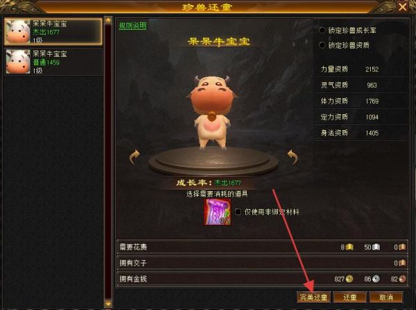 玩家还可花费元宝进行完美还童确保获得完美成长率的珍兽。