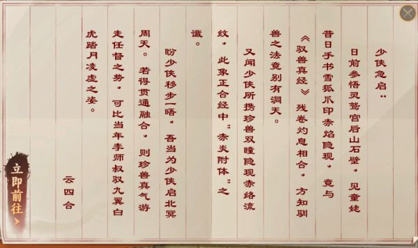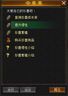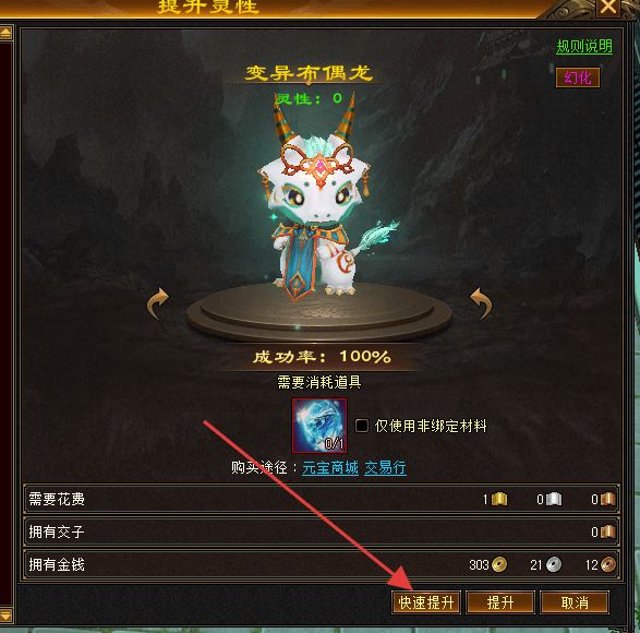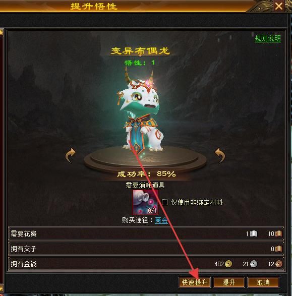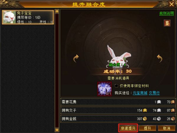快捷提升:支付一定数量的元宝,可将悟性直接提升至上限悟性10级。消耗的元宝数量与珍兽原来的悟性等级高低有关。