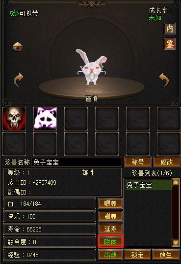 在珍兽栏内选择珍兽后,可使该珍兽进行附体。未出战的珍兽点击附体按钮,技能释放完毕,即附体成功。若该珍兽学习过附体技能,则该珍兽拥有的附体技能全部生效。附体后,玩家角色获得附体状态,效果为角色全属性提升10点。