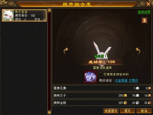注意:融合度从0提升到5时融合度值不能超过悟性,融合度5提升到10时,融合度的值不能超过悟性与灵性。