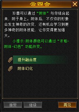 融合度代表了与附体珍兽的契合程度,融合度越高,附体的技能效果越强,当融合度提于到4、7、9时,将不再回退,并且能获得更炫的外形。