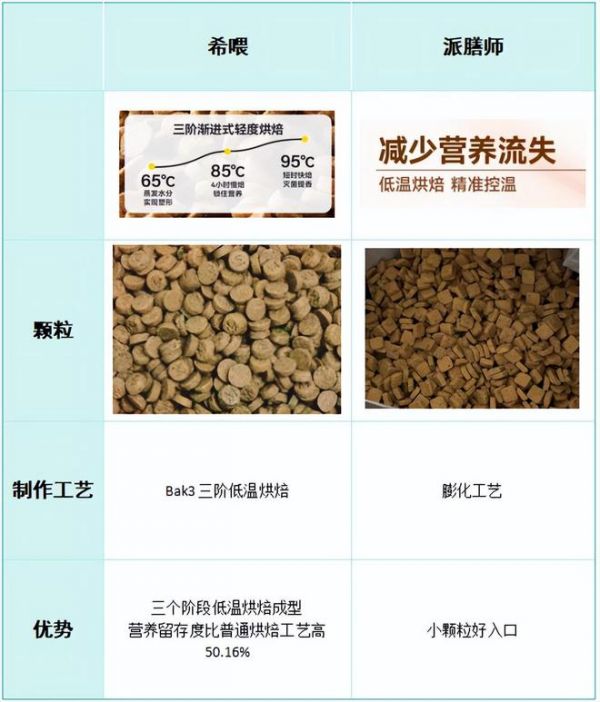 希喂:希喂的Bak3三阶低温烘焙工艺是联合山东汉欧的核心技术打造的。作为国内头部宠物食品代工厂,山东汉欧烘焙技术成熟,拥有国际权威认证的生产体系与丰富经验。所以希喂的烘焙技术也足够成熟可靠,整个流程通过三个阶段控温实现精准加工。相比普通烘焙工艺,希喂狗粮的营养留存度更高出 50.16%,能更好保留蛋白质、维生素等核心营养。