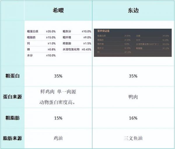 东边:东边的蛋白质主要由鸭肉提供,因为是主打降火的产品,所以在降火上也有不错的效果,适合容易上火没什么其他问题的狗狗。
