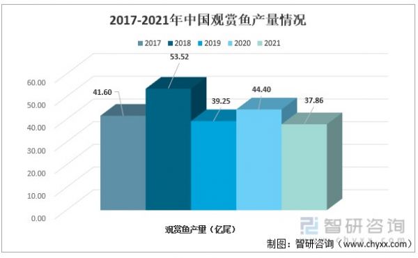 但近年来,由于一些季节和气候的原因,某些养殖场对观赏鱼过度开发,死亡率也随之上升,导致物种种源逐渐衰弱,过度开发、毁灭性采捕以及高死亡率是影响观赏鱼产业持续性发展的最根本性原因,导致目前观赏鱼的进出口数量逐渐减少,2017年至2021年的数据可以看出,观赏鱼的产量处于下降趋势,从2017年的41.6亿尾到2021年的37.86亿尾。