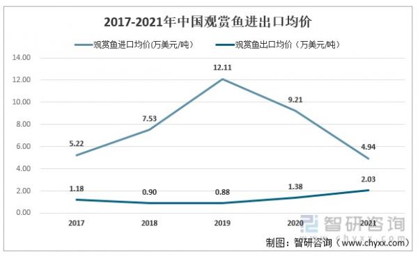 2017-2021年中国观赏鱼的进口均价远高于出口均价,观赏鱼的出口均价逐年上升,但上升幅度不大,2021年观赏鱼的进口均价为2.03万美元/吨,同比增长47.1%;观赏鱼的出口均价波动比较大,2021年的出口均价为4.94万美元/吨,同比下降46.36%。