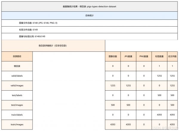 • berkshire(巴克夏猪):优质黑毛猪品种,以肉质鲜美著称;• duroc(杜洛克猪):红毛猪品种,生长速度快、饲料转化率高;• landrace(长白猪):白猪品种,产仔数多、繁殖性能优异;• pietrain(皮特兰猪):花色猪品种,瘦肉率高,是常见的杂交亲本之一。 • 数据规模:数据集包含 6148 张 JPG 格式图像,配套 6149 个标签文件,按模型开发流程分为三个子集: