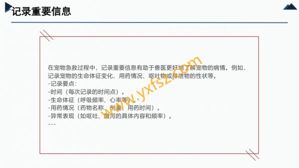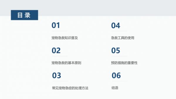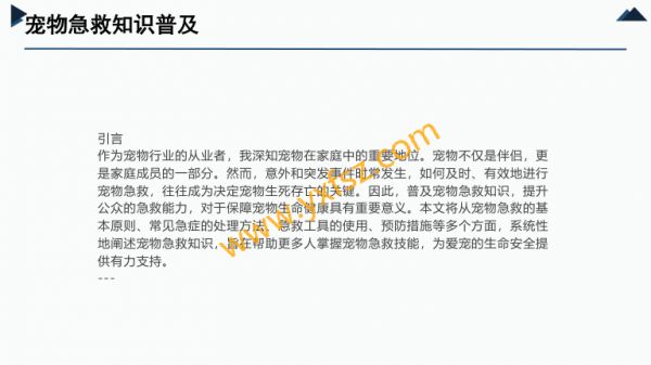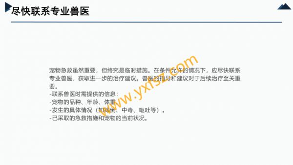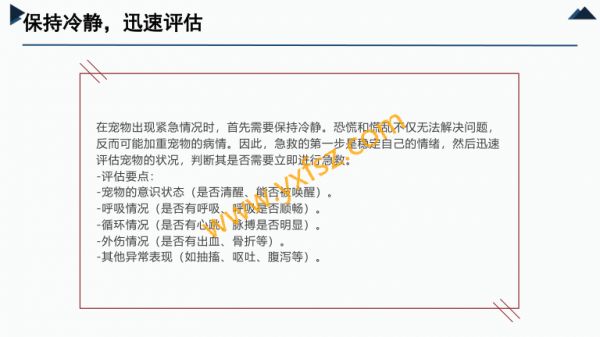 202X宠物急救知识普及演讲人2025-12-10目录0104宠物急救知识普及急救工具的使用0205宠物急救的基本原则预防措施的重要性0306常见宠物急症的处理方法结语PART ONE宠物急救知识普及01宠物急救知识普及引言作为宠物行业的从业者,我深知宠物在家庭中的重要地位宠物不仅是伴侣,更是家庭成员的一部分然而,意外和突发事件时常发生,如何及时、有效地进行宠物急救,往往成为决定宠物生死存亡的关键因此,普及宠物急救知识,提升公众的急救能力,对于保障宠物生命健康具有重要意义本文将从宠物急救的基本原则、常见急症的处理方法、急救工具的使用、预防措施等多个方面,系统性地阐述宠物急救知识,旨在帮助更多人掌握宠物急救技能,为爱宠的生命安全提供有力支持---PART ONE宠物急救的基本原则02保持冷静,迅速评估在宠物出现紧急情况时,首先需要保持冷静恐慌和慌乱不仅无法解决问题,反而可能加重宠物的病情因此,急救的第一步是稳定自己的情绪,然后迅速评估宠物的状况,判断其是否需要立即进行急救-评估要点-宠物的意识状态(是否清醒、能否被唤醒)-呼吸情况(是否有呼吸、呼吸是否顺畅)-循环情况(是否有心跳、脉搏是否明显)-外伤情况(是否有出血、骨折等)-其他异常表现(如抽搐、呕吐、腹泻等)确保自身安全在进行宠物急救时,必须确保自身安全某些情况下,宠物可能因为疼痛或恐惧而攻击人,因此需要采取适当的防护措施-安全措施-使用宠物牵引绳或布条固定宠物,防止其突然移动-戴上手套,避免直接接触宠物的血液或体液-如果宠物有攻击性,可以使用长杆工具(如棍子)进行间接操作尽快联系专业兽医宠物急救虽然重要,但终究是临时措施在条件允许的情况下,应尽快联系专业兽医,获取进一步的治疗建议兽医的指导和建议对于后续治疗至关重要-联系兽医时需提供的信息-宠物的品种、年龄、体重-发生的具体情况(如摔倒、中毒、呕吐等)-已采取的急救措施和宠物的当前状况记录重要信息在宠物急救过程中,记录重要信息有助于兽医更好地了解宠物的病情例如,记录宠物的生命体征变化、用药情况、呕吐物或排泄物的性状等-记录要点-时间(每次记录的时间点)-生命体征(呼吸频率、心率等)-用药情况(药物名称、剂量、用药时间)-异常表现(如呕吐、腹泻的具体内容和频率)---PART ONE常见宠物急症的处理方法03中毒急救宠物中毒是常见的紧急情况,处理不当可能导致严重后果甚至死亡因此,掌握中毒急救知识至关重要中毒急救判断中毒原因01020304-常见中毒物质-人用药(如止痛药、-化学品(如杀虫剂、-食物(如巧克力、抗抑郁药)消毒剂)葡萄、洋葱)05060708-植物类(如百合花、-判断方法-观察宠物是否接触-询问主人宠物是否误绣球花)过可疑物质食了特定药物或食物中毒急救紧急处理措施-催吐-使用方法将宠物倒立,用手指或0102羽毛刺激喉咙,促使宠物呕吐-注意事项催吐前需咨询兽医,避-导泻0304免催吐导致宠物窒息-适用于无法催吐或催吐无效的情况-使用方法口服泻药(如乳果糖),0506促进毒物排出-注意事项导泻前需咨询兽医,避-洗胃0708免毒物在肠道内进一步吸收-适用于误食腐蚀性毒物或需要彻底-适用于误食毒物不久且宠物清醒的0910清除毒物的情况情况中毒急救紧急处理措施-操作方法由兽医-药物治疗-根据毒物种类,兽-注意事项切勿自进行,避免自行操作医可能会使用特定的行给宠物用药,以免导致宠物窒息或消化解毒药物加重病情道损伤中毒急救预防措施-保持家中药品和化学品安全存放-避免宠物接触有毒植物-定期清理家中易被宠物误食的小物-外出时注意宠物是否可能误食有毒品(如针线、电池)物质(如蚂蚁药、除草剂)脱臼急救宠物脱臼是常见的急诊情况,通常发生在宠物摔倒或受到外力冲击时正确处理可以减少宠物痛苦,为后续治疗争取时间脱臼急救判断脱臼01020304-典型症状-关节肿胀、-宠物无法活-呼吸困难变形动受伤部位(如颈椎脱臼)050607-判断方法-观察宠物的-检查受伤部行为变化位是否有明显异常脱臼急救紧急处理措施01020304-固定受伤部位-使用绷带或布条-固定时需确保宠-减少疼痛固定受伤部位,物能够正常呼吸,避免宠物进一步避免压迫胸腔移动050607-可在兽医指导下-尽快就医-脱臼需要兽医进行复位,自行复使用止痛药,但位可能导致永久切勿自行用药性损伤脱臼急救预防措施-避免宠物进行高风险运动(如跳跃、攀爬)-家中环境保持安全,避免宠物摔倒-定期检查宠物的关节健康状况,尤其是老年宠物出血急救宠物出血是常见的紧急情况,可分为内出血和外出血正确处理可以减少宠物失血量,为后续治疗争取时间出血急救判断出血类型-外出血-表现为皮肤或黏膜出血,可-常见于切割伤、咬伤等见鲜红色血液-内出血-表现为宠物精神萎靡、呼吸-常见于骨折、内脏损伤等急促、心率加快等-判断方法-外出血可通过观察伤口判断-内出血需通过兽医检查(如触诊、X光)确诊出血急救紧急处理措施0102030405-外出血处理-用干净的布或-如果血液无法-抬高受伤部位-对于四肢出血,绷带直接压迫伤可将受伤部位抬停止,可在伤口口,持续按压5-高,减少血液回周围继续加压10分钟流0607080910-止血药-可在兽医指导-尽快就医-外出血需要兽-直接压迫止血医进行进一步处下使用止血药,理,如清创、缝但切勿自行用药合等出血急救紧急处理措施010203-内出血