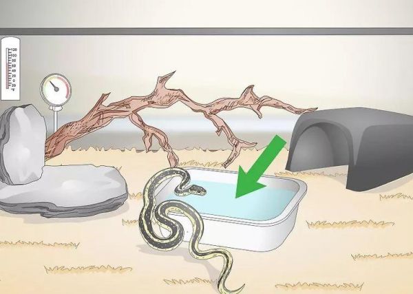 水盆。必需品,水盆的大小最好你能够容纳其体形,供其泡澡(对其消暑降温、蜕皮、进食后缓解压力等大有裨益),当然对于体形较大的蛇类,保持湿度适宜,水盆仅用于喝水也是可以的。太轻或重心不稳的水盆可能会被打翻,陶瓷水盆是不错的选择。注意饮水卫生,部分蛇类会在水内排便,此时需立即清洗换水,否则误喝脏水会引起肠胃问题。