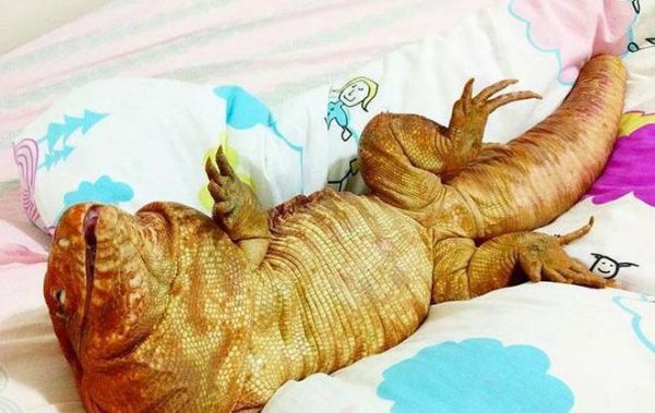 蜥蜴在趴在一边陪着主人,看它睡觉的样子,真是萌坏了。
