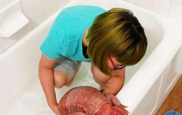 每天,女孩都会给蜥蜴洗澡澡。