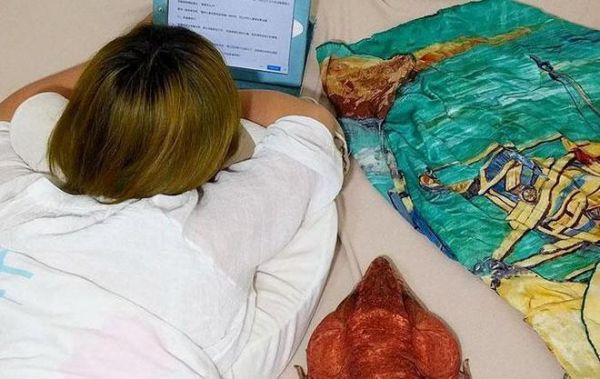 蜥蜴正趴在女孩的身上。女孩平时会在网上直播自己和蜥蜴的生活,吸引了很多人的收看。