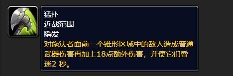 对面前锥形区域中的敌人造成普通武器伤害加上18点额外伤害,并使敌人昏迷2秒。
