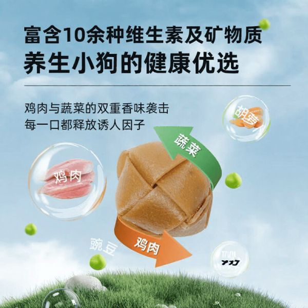 纯天然成分:选用玉米淀粉、豌豆粉及鸡肉粉,不添加人工成分,致力于为爱犬提供更健康、更安全的美味体验。