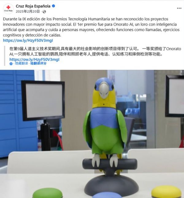 在巴塞罗那举行的世界移动通信大会 (MWC)期间,举行了第九届人道主义技术奖颁奖典礼,西班牙红十字会将一等奖授予了这只AI鹦鹉。