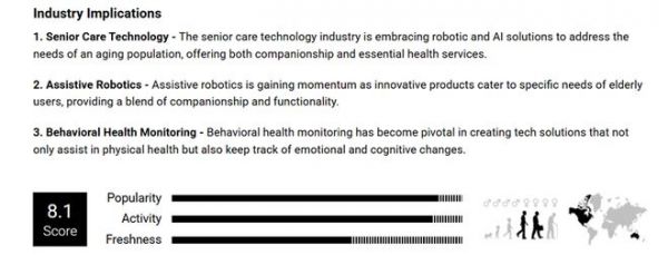 全球规模最大、最受欢迎的趋势网站Trend Hunter评价其为“专为老年人设计的机器人宠物,旨在为日益增多的独居老人提供照护和陪伴。”,并给出了8.1的高分。