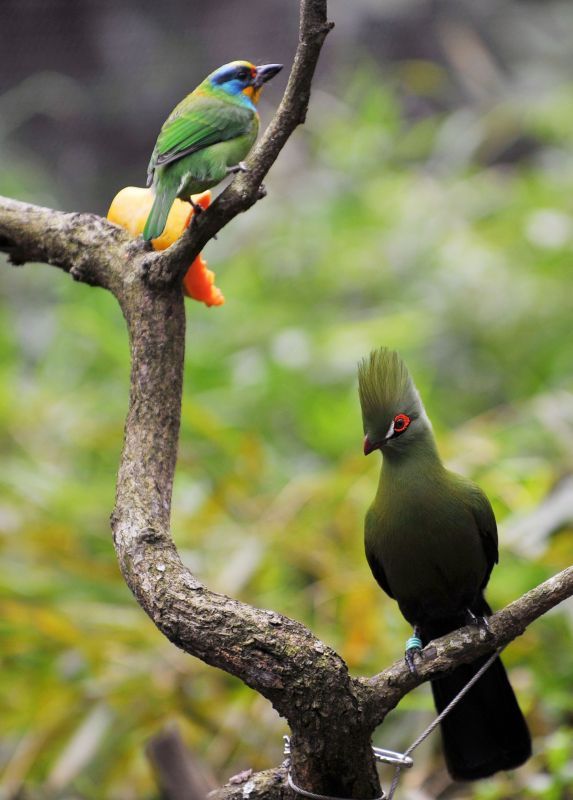 台海网(微博)12月7日讯 据新华社报道,12月7日在台北动物园的生态鸟园里拍摄的一只绿丝冠僧帽鸟(下)和一只五色鸟。当日,台北动物园生态鸟园经整修后重新开放。台北动物园生态鸟园建于1986年,1987年对外开放,2012年开始进行网笼全面更新工程。据介绍,台北动物园生态鸟园共展出约32种200只鸟类,以树栖鸟类为主,地面及水面活动的鸟类为辅,营造出鸟类自然生活的氛围。