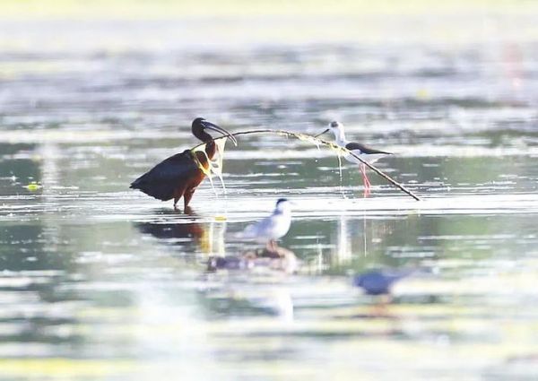 彩鹮叼着树枝准备筑巢。(湖北日报通讯员 曾波 摄)