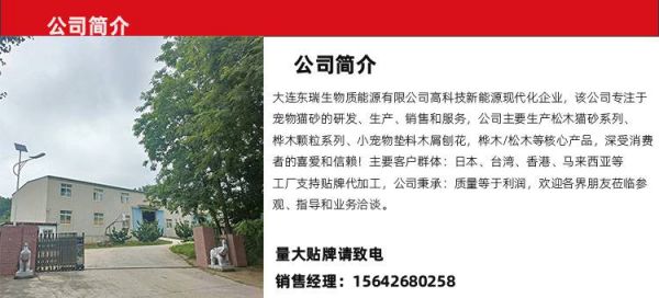 大连东瑞生物质能源有限公司高科技现代化企业,该公司专注于宠物猫砂的研发、生产、销售和服务,环保再制品天然松木猫砂、绿茶松木猫砂、活性炭猫砂、小宠用砂兔子、仓鼠专用桦木颗粒深受消费者的喜爱和信赖!公司主要客户群体:日本、台湾、香港、马来西亚、新加坡、泰国支持贴牌,公司秉承:质量等于利润,优质产品是市场竞争必胜的***的原则,欢迎各界朋友莅临参观、指导和业务洽谈。 公司经营理念:以质量求生存 以诚信求发展