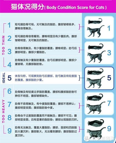在兽医上,主要使用体况评分(BCS)来评估猫咪的胖瘦程度,简单点就是靠视觉和触觉来判断。