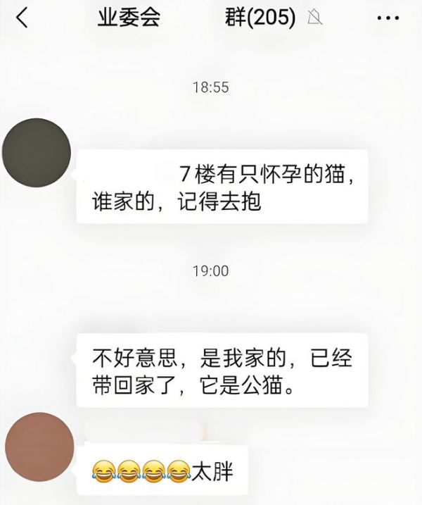 楼道里一只胖乎乎的猫蜷缩着,业主群里有人焦急地询问:“谁家走失的怀孕母猫在楼道?”主人尴尬回复:“它是公的,已抱走!”