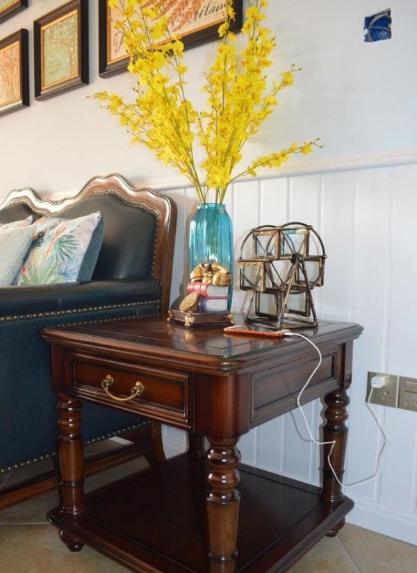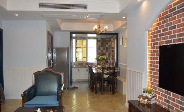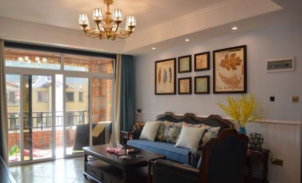 整个客厅运用了很多蓝色的元素人,让人感觉十分的清爽优雅,客厅的沙发则是比较传统的美式实木搭配皮质外包,再搭配家里的碎花抱枕营造出了一种清新淡雅的美式田园风格。