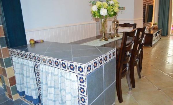 餐厅和厨房之间有一个小吧台作为隔断,小花砖和小格子的布帘让吧台变得更有意境,也让沉闷的蓝色变得富有生机和活力。