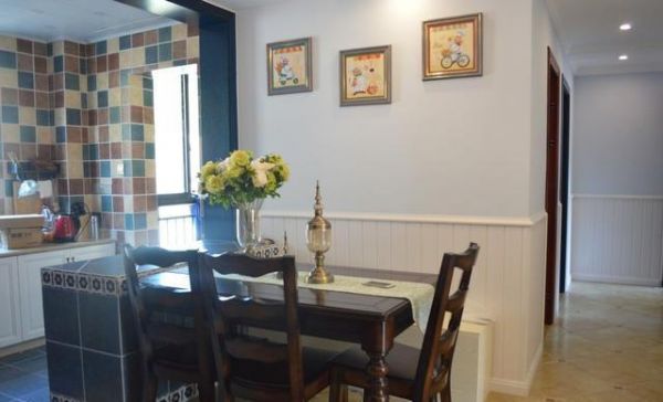 餐厅同样选择了实木的桌椅,业主还很用心地在餐桌上面摆放了鲜花和桌布,让一日三餐都变得更有仪式感,旁边墙壁上的艺术画也很可爱。