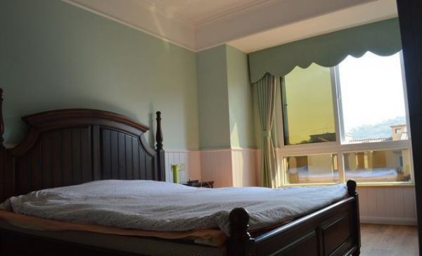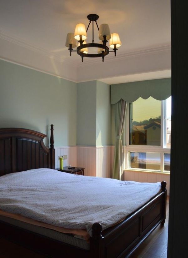 卧室的墙壁和窗帘都是选择了草绿色的设计,墙壁的下半部同样是白色的防护墙,清新的颜色让整个卧室都很舒适,营造出了一种温馨自然的风格。