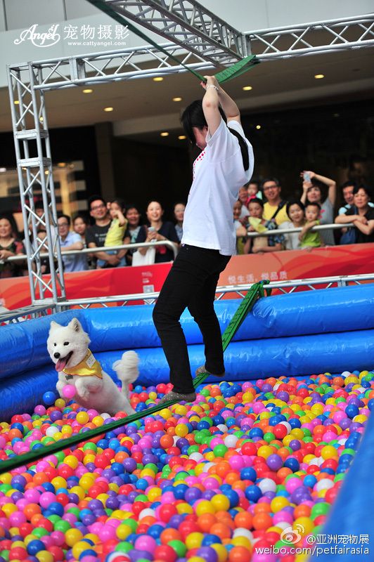④飞天入海:主人从扁带通过,狗狗从海洋球池通过