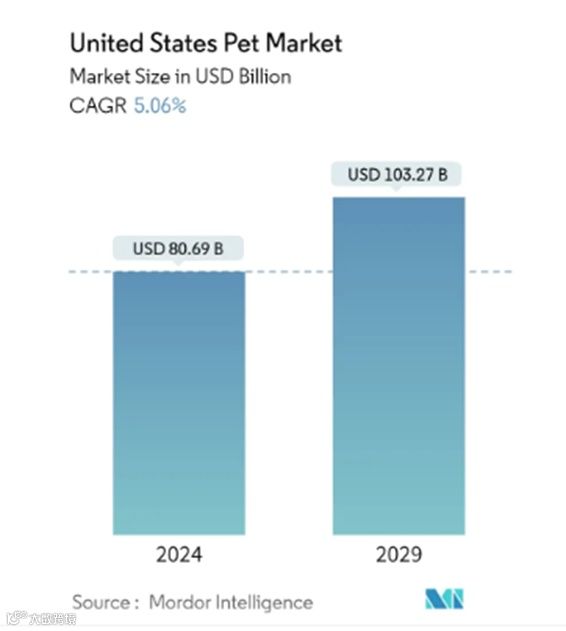 Global Market Insights数据显示:预计到2027年,全球宠物行业规模将突破3500亿美元,2022–2027年复合增长率约6.1%。其中美国为最大单一市场,2024年规模约800亿美元,预计2029年达1032.7亿美元。