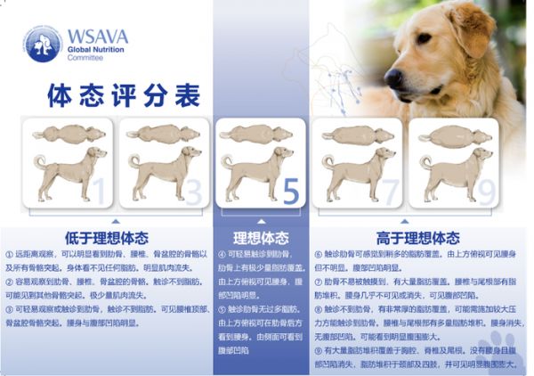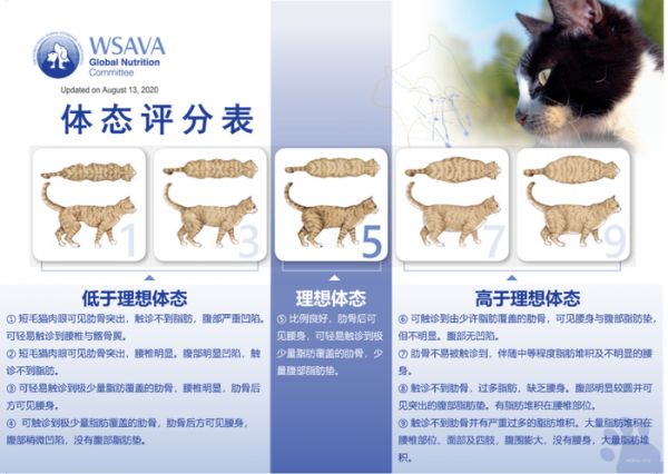 体格检查包括确认动物的体况评分(body condition score,BCS)、肌肉评分和其他相关诊断检查等。体况评分指采用目测和触摸方式,对犬猫个体体躯和关键部位脂肪沉积状况进行评分,以分值表示个体营养健康状况和体脂含量的方法。针对犬猫建议使用9分制评分系统。