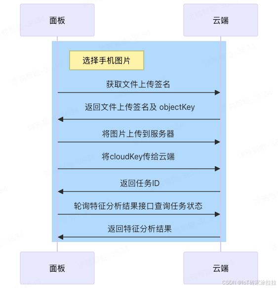 交互流程 使用 chooseImage 从手机选择图片;请求云端获取文件上传签名及对应的 objectKey;将图片上传至指定服务器;将步骤 2 返回的 objectKey 作为参数传递给特征分析接口,该接口会返回一个 taskId,之后通过轮询特征分析结果接口获取分析进度。 若返回的 analysisResult 值为 2,则表示分析成功;若值为 1,则表示分析失败,根据返回的结果展示相应的分析信息。